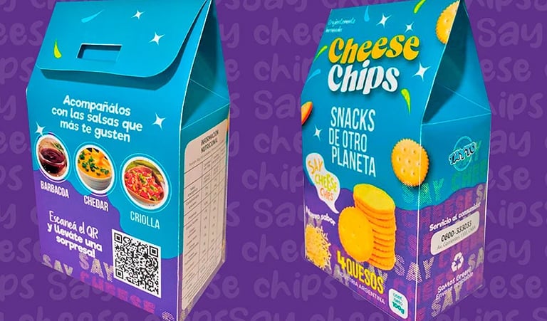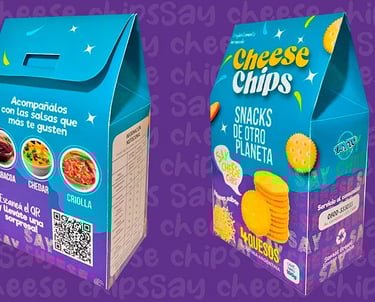 Packagin, diseño y lanzamiento de marca. Cheese Chips es un proyecto de snacks irresistibles por su sabor y colorida presentación.